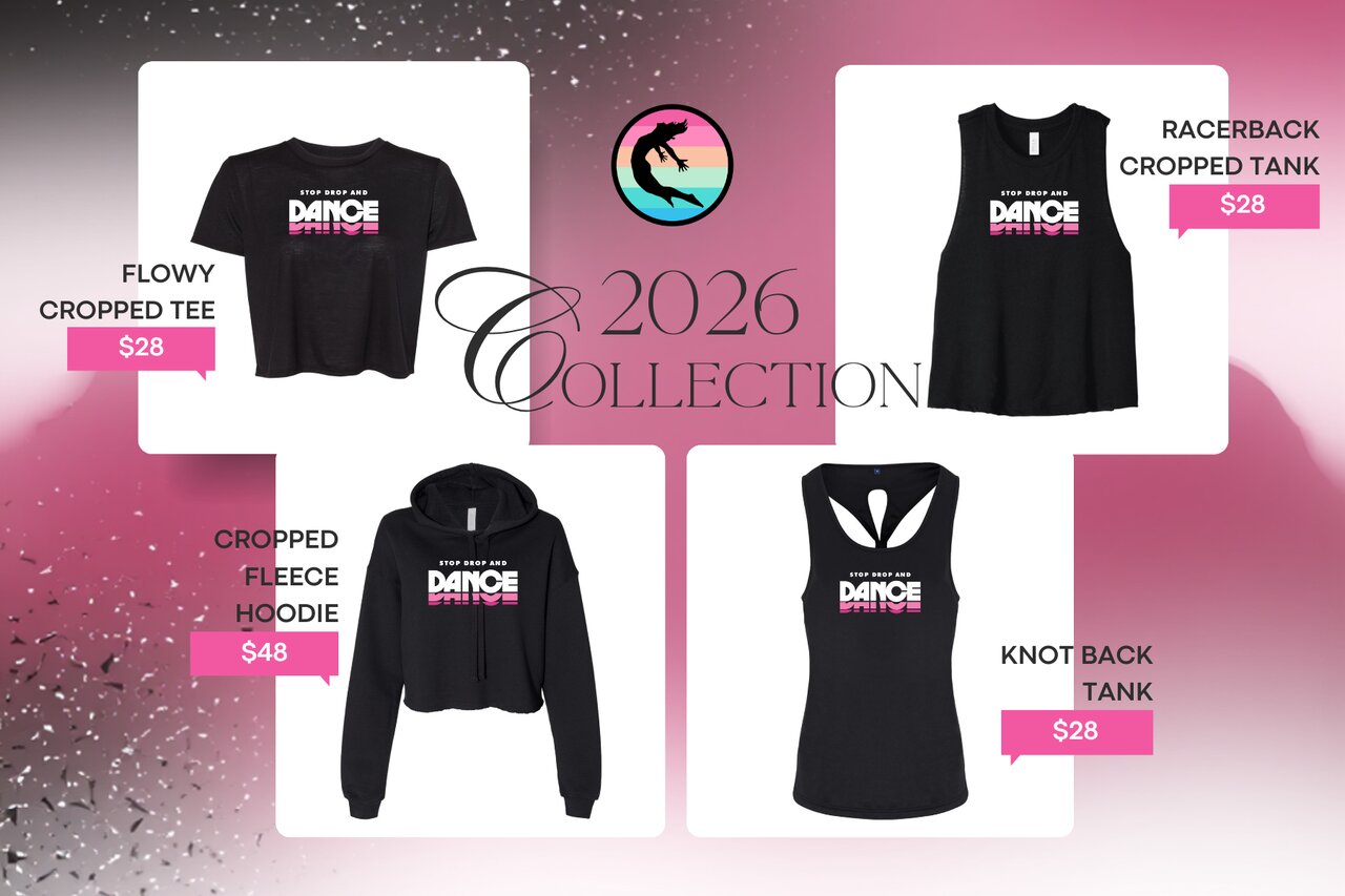 Our very first shirt was created back in 2019 for our first 3 hour Stop Drop and Dance-a-thon in San Francisco. The shirt was a heathered black racerback tank with "Stop Drop and Dance" foil printed in cursive gold lettering. Since then, we have printed shirts every year with song titles like "Better When I'm Dancing," "Never Gonna Not Dance Again," or "Shine Your Light," but it is time to bring back a classic "Stop Drop and Dance" shirt.